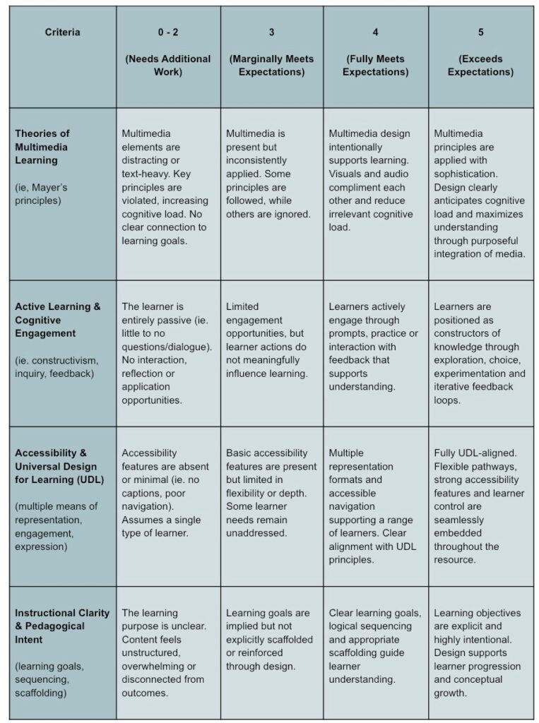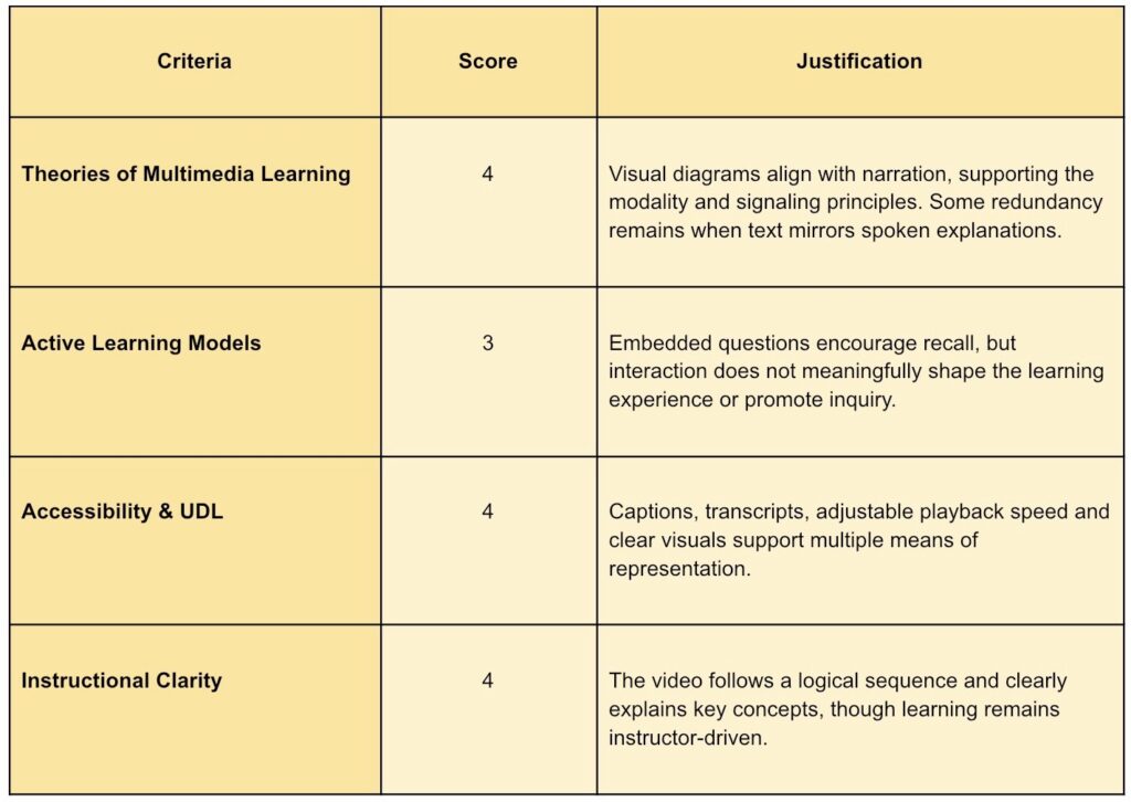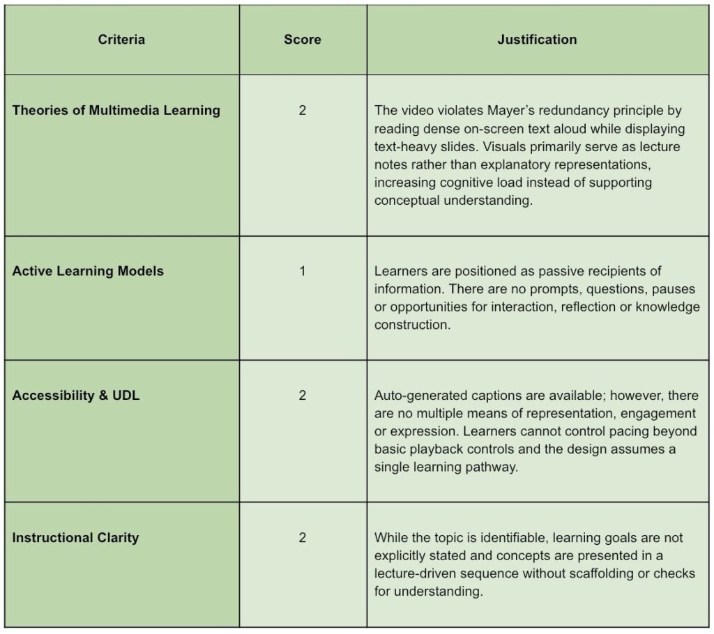 This resource demonstrates strong alignment with multimedia learning theory and accessibility practices but only partially engages learners in active meaning-making.