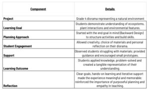When I planned a grade 4 diorama project last spring on natural environments, I began by imagining what a successful final product would look like and how students could demonstrate their understanding of ecosystems. This clarity gave direction to the entire project. I was able to scaffold activities that gradually built knowledge of habitats and ecological interactions, while still leaving space for students’ creativity and personal expression. Students experimented with materials, made choices about which natural elements to include, and reflected on how their dioramas represented ecosystems. The process reinforced for me how powerful it is to start with the “why” of learning, helping students find purpose in their work and making lessons both engaging and meaningful.