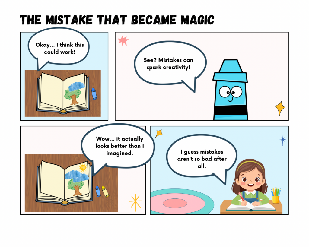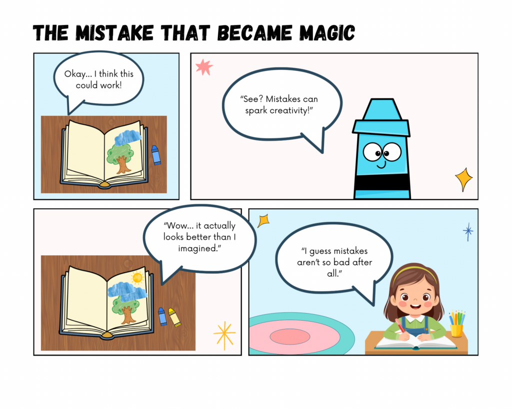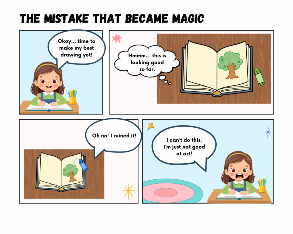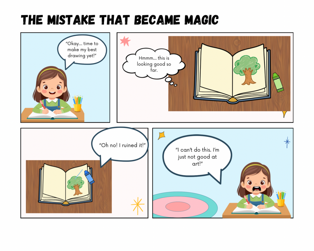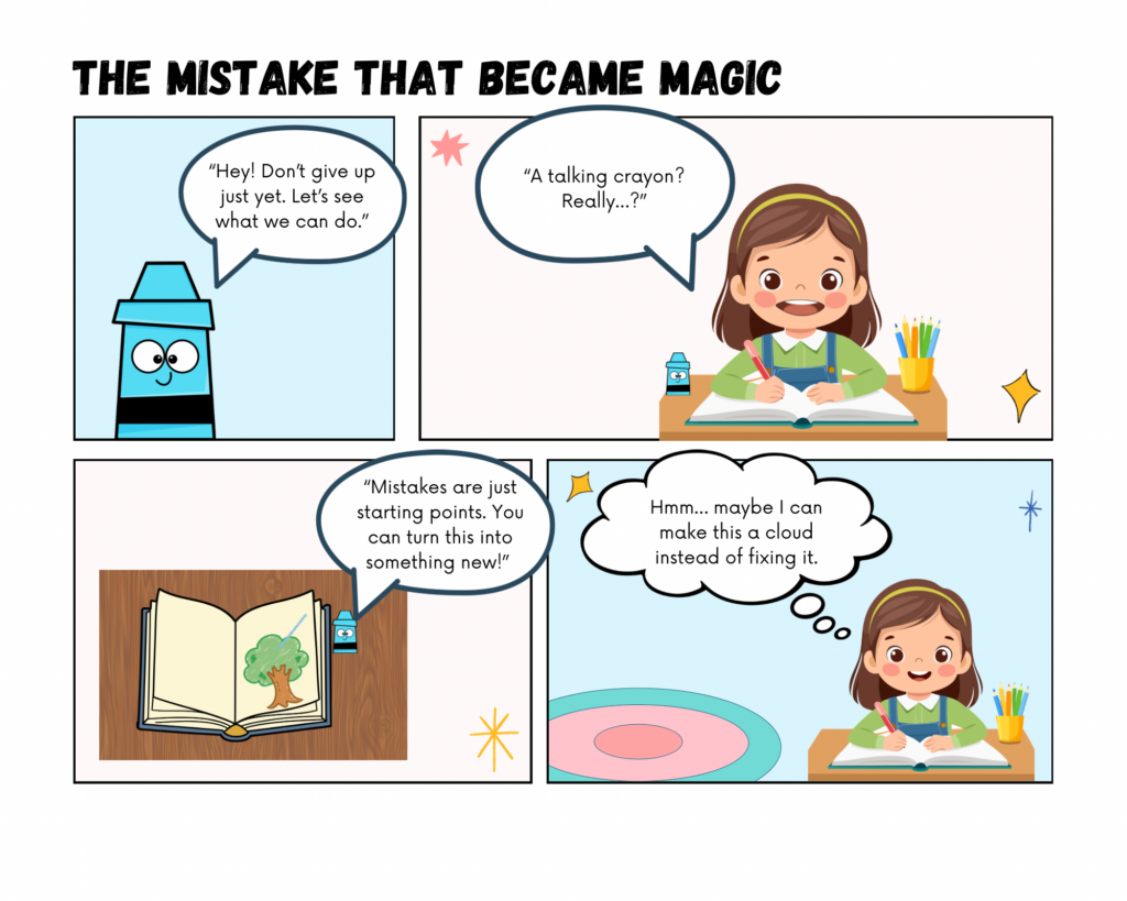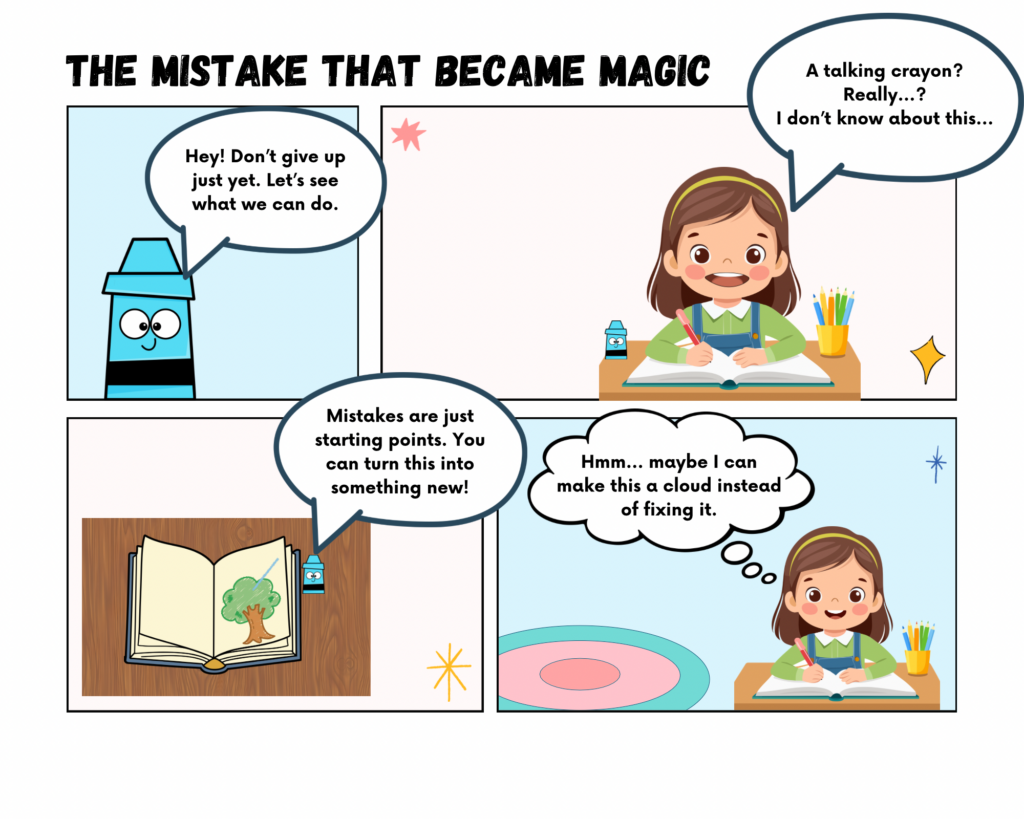 I am creating an educational comic that explores how mistakes can become opportunities for creativity and learning. The story follows a student who feels frustrated after âruiningâ a drawing and wants to quit. Through the guidance of an imaginative character (a crayon), the student learns to see mistakes as part of the creative process rather than as failure. I chose this topic because growth mindset and creative problem solving are essential ideas in both art education and classroom learning. Many students become discouraged when work does not match their expectations and I wanted to create a story that models a more supportive and realistic response to frustration.